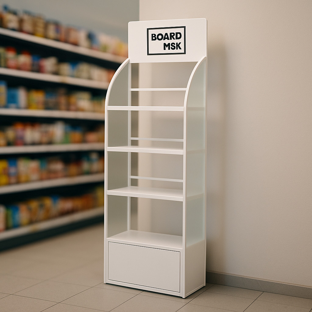 Буклетница в современном стиле - идеальное решение для презентации рекламных материалов, журналов и каталогов. Прочная металлическая конструкция обеспечивает устойчивость и долговечность, а боковые панели из матового стекла придают изделию лёгкость и изысканный внешний вид. Полки выполнены из дерева, создавая тёплый акцент и подчёркивая премиальный характер конструкции.