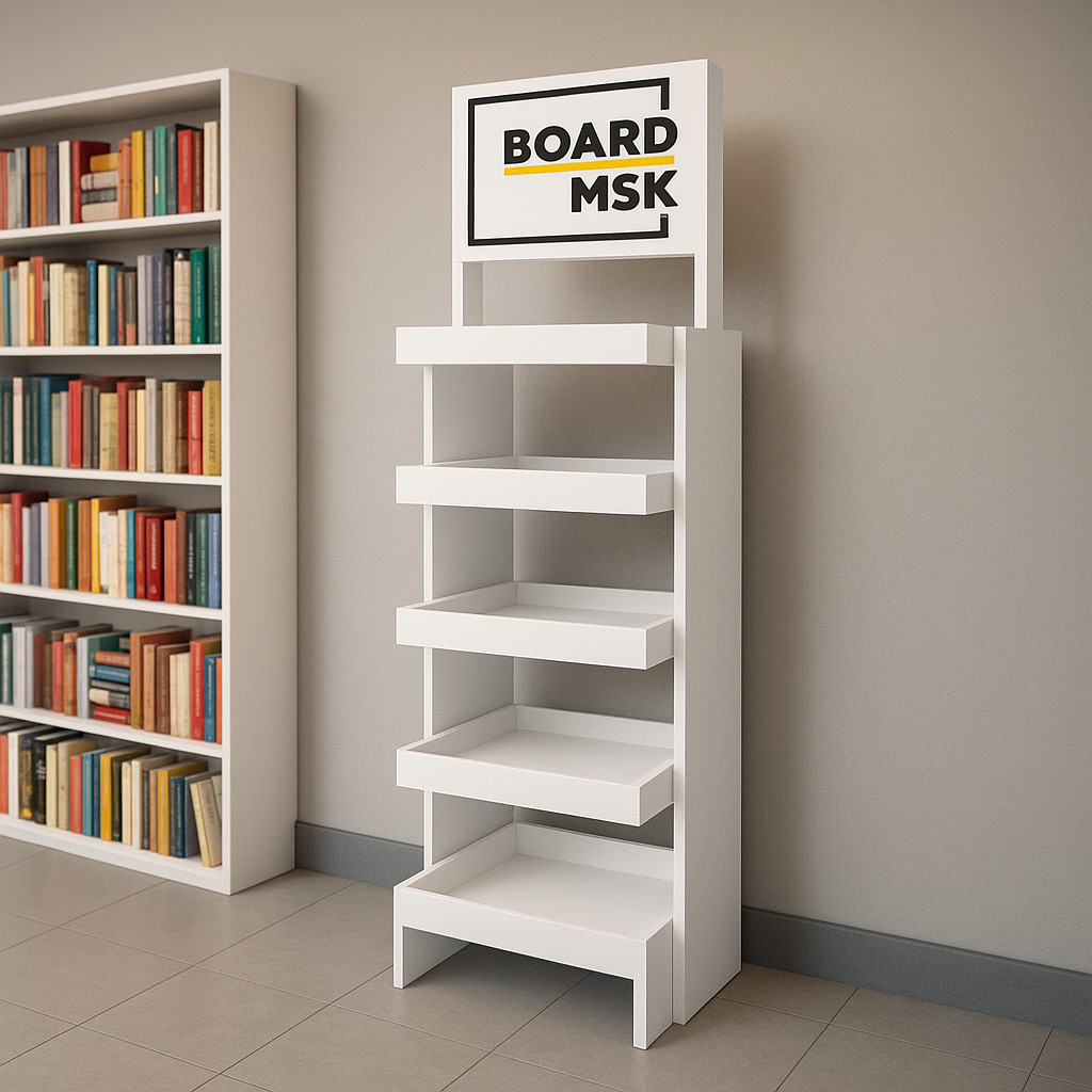 Буклетница деревянная с горизонтальными полками — это элегантный и надёжный элемент выставочного или офисного оборудования, предназначенный для аккуратного размещения и демонстрации печатных материалов: буклетов, журналов, каталогов и рекламных проспектов.