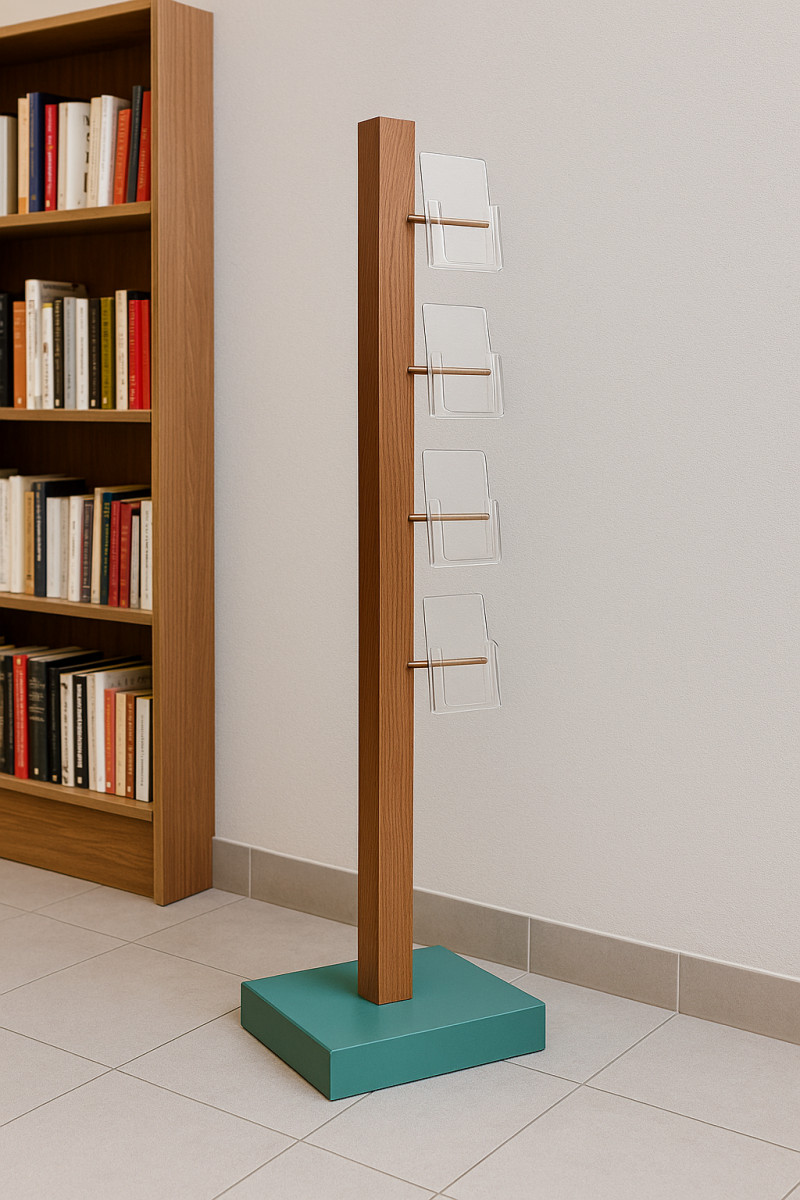 Деревянная буклетница с объёмными пластиковыми карманами — функциональное и эстетичное решение для презентации печатных материалов в офисах, салонах, торговых залах и на выставках. Конструкция сочетает прочность натурального дерева и лёгкость прозрачных пластиковых карманов, обеспечивая удобный доступ к буклетам и привлекательную подачу информации.