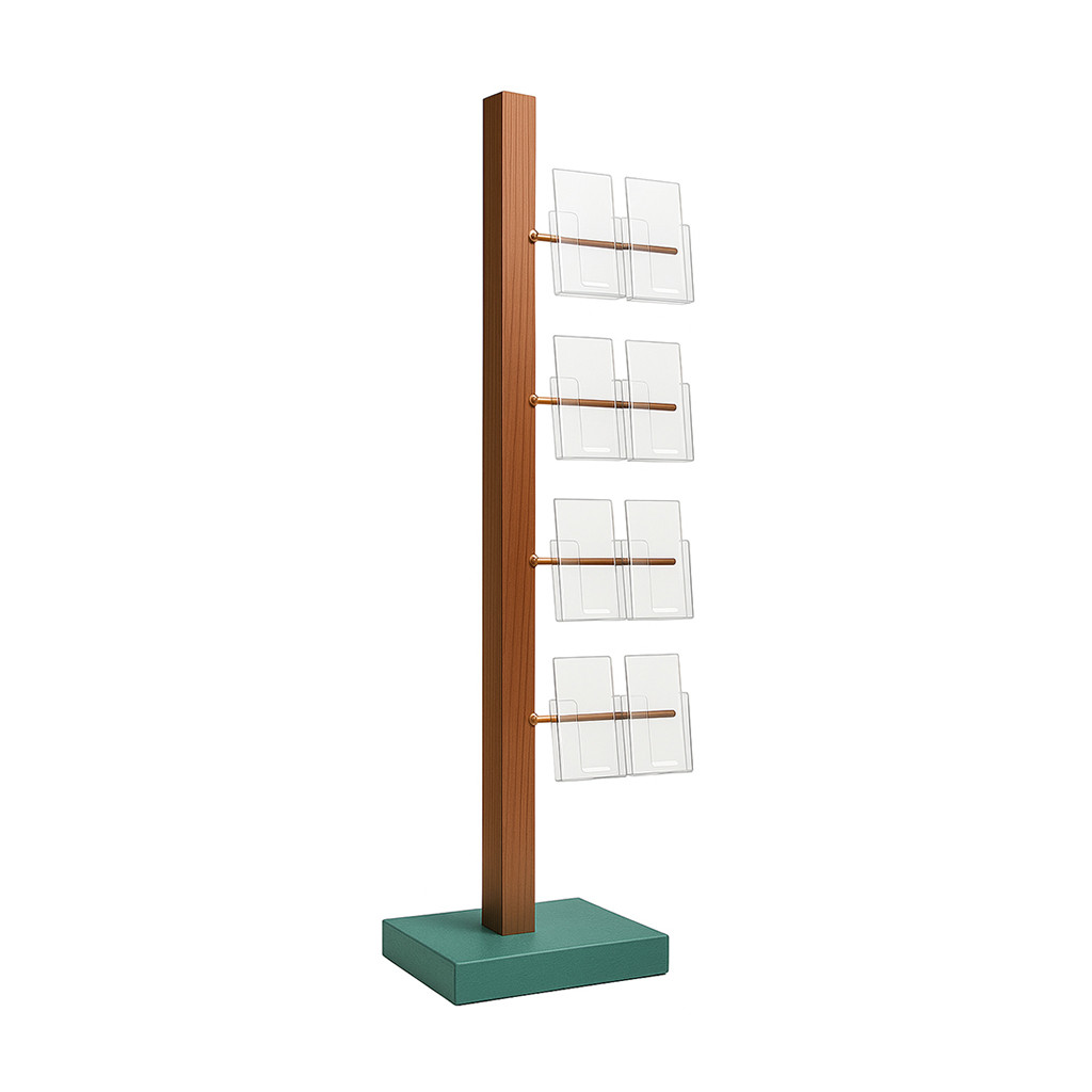 Деревянная буклетница с объёмными пластиковыми карманами — функциональное и эстетичное решение для презентации печатных материалов в офисах, салонах, торговых залах и на выставках. Конструкция сочетает прочность натурального дерева и лёгкость прозрачных пластиковых карманов, обеспечивая удобный доступ к буклетам и привлекательную подачу информации.