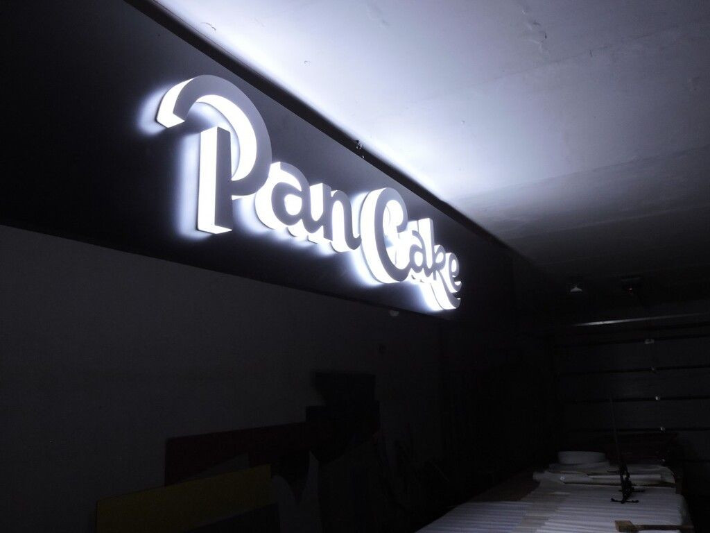 Лёгкие плоские буквы из ударопрочного полистирола с мягким фоновым свечением на стену. Решение для интерьеров, ресепшен-зон, витрин и фасадов под навесом.