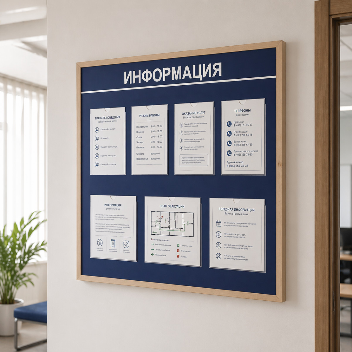 - Информационный стенд настенный Board-msk деревянный на колесиках, 7 отделений - А4