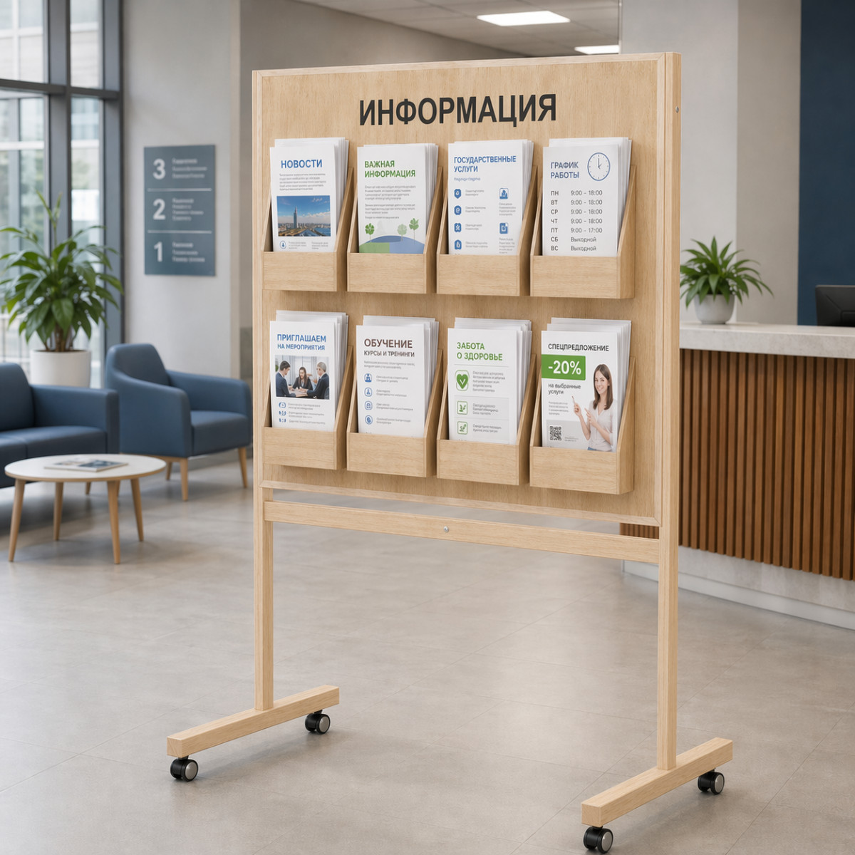 - Мобильный информационный стенд напольный Board-msk деревянный на колесиках, 7 объемных карманов