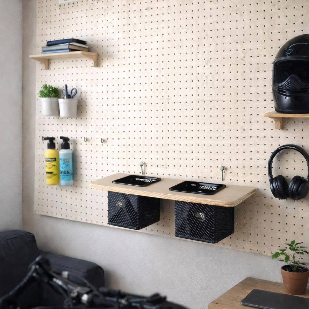 Полка-органайзер для пегборда с двумя сетчатыми стаканами — удобное решение для хранения канцелярии, инструментов и мелочей прямо на рабочей зоне. Два металлических стакана удерживают ручки, маркеры, кисти, ножницы и другие предметы, которые должны быть под рукой. Модуль легко устанавливается на пегборд и помогает поддерживать порядок без лишних коробок и ящиков.
