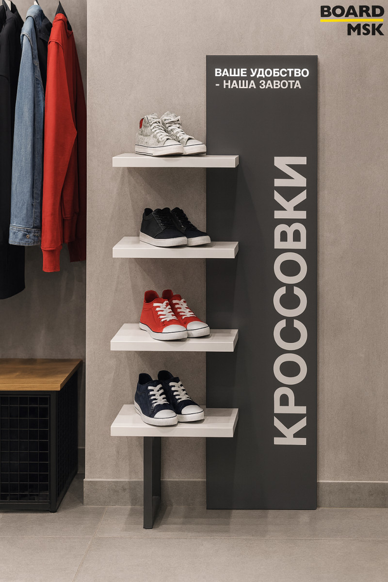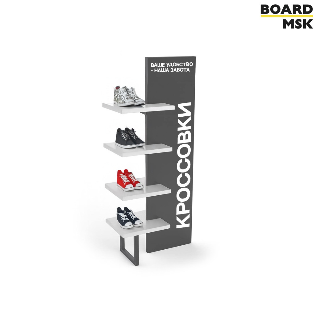 - Промостойка из дерева с отделением под логотип и 4 полками