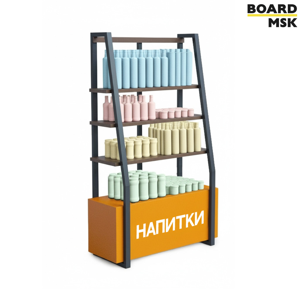 - Промостойка вертикальная из дерева с 4 полками и отделением под логотип