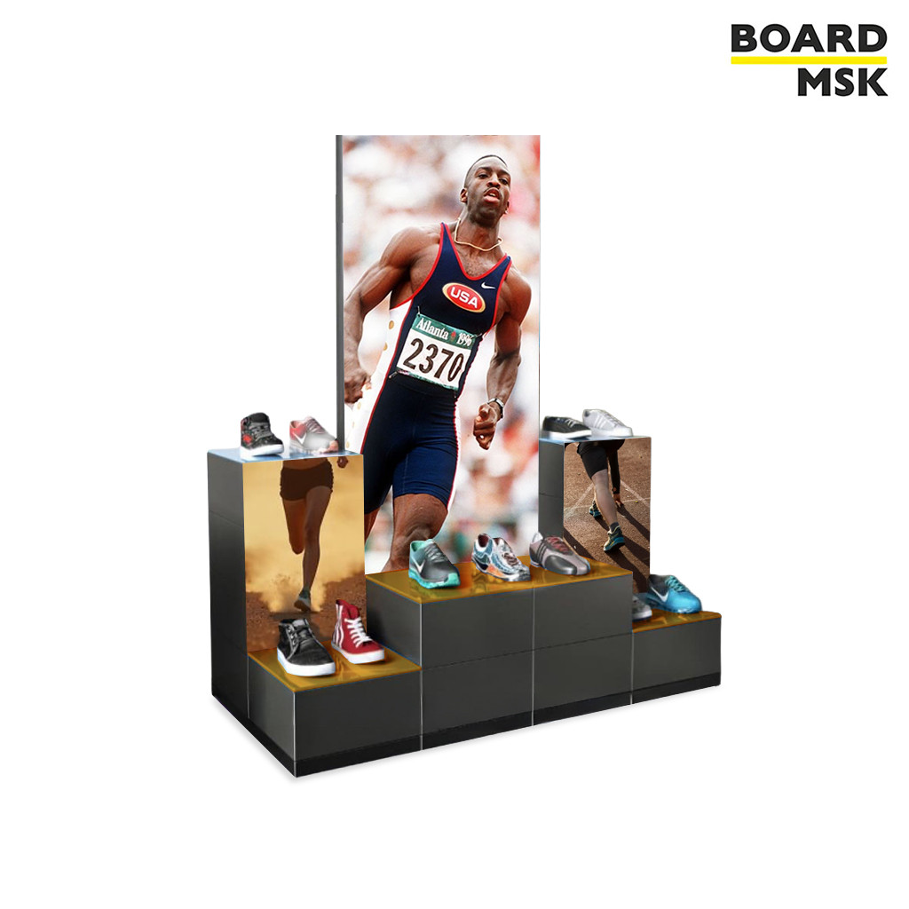 Подиум оснащён рекламными полями под печать, которые можно брендировать логотипом, акциями или графикой. Это усиливает визуальное восприятие, повышает узнаваемость бренда и работает как дополнительный рекламный носитель прямо в торговом пространстве.